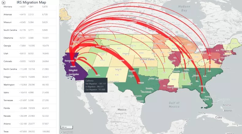 California was followed by New York, which lost similar numbers of residents, many of whom decamped to Florida and New Jersey. Interestingly, those leaving New York had incomes $17,000 higher than those migrating to New York.